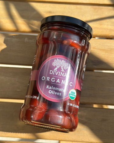 Divina Organic Kalamata Olives are handpicked organic olives from Greece, known for their rich flavor with fruity and slightly wine-like notes, as well as their firm, meaty texture.