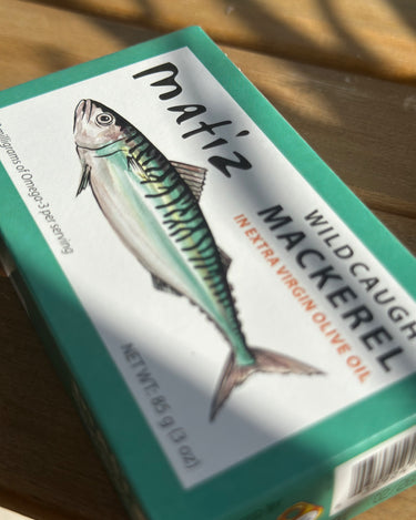 Matiz Wild Caught Mackerel in Organic Extra Virgin Olive Oil features mackerel fillets caught in the open waters of the Atlantic, Pacific, and Mediterranean Seas, hand-packed in Galicia, Spain. The mackerel offers a rich flavor, firm yet tender texture, and a mild, buttery taste.